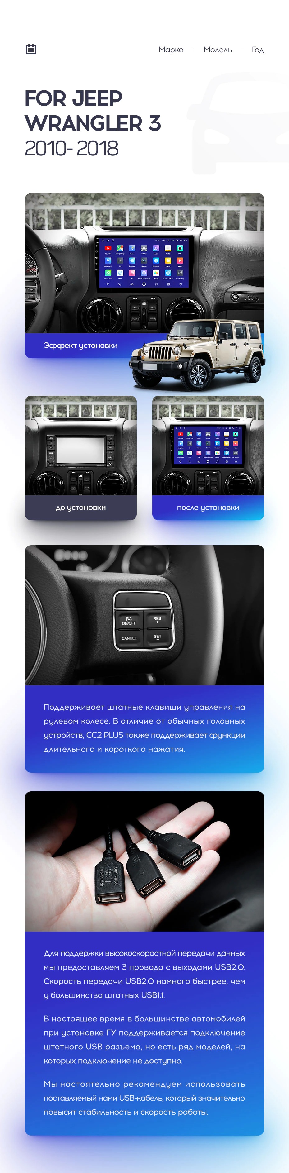 Полный комплект установки магнитолы Teyes с рамкой и проводкой можно выбрать в каталоге штатных магнитол Jeep Wrangler 3 JK (2010-2017).